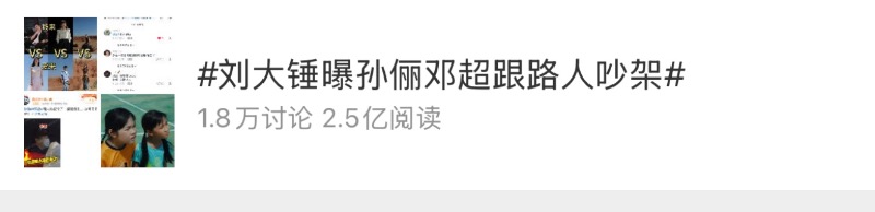 隨著視頻公開,火速登上熱搜第一,熱搜詞條是「劉大錘曝孫儷鄧超和路人吵架」,閱讀量多達2.5億👇