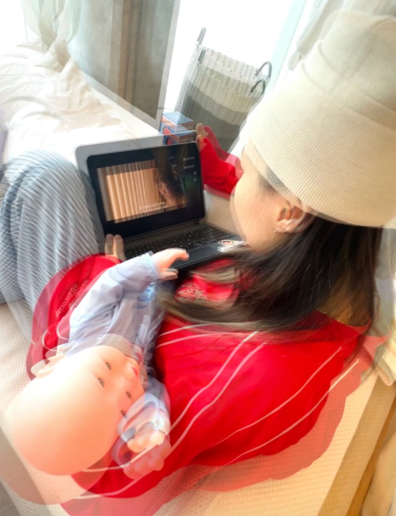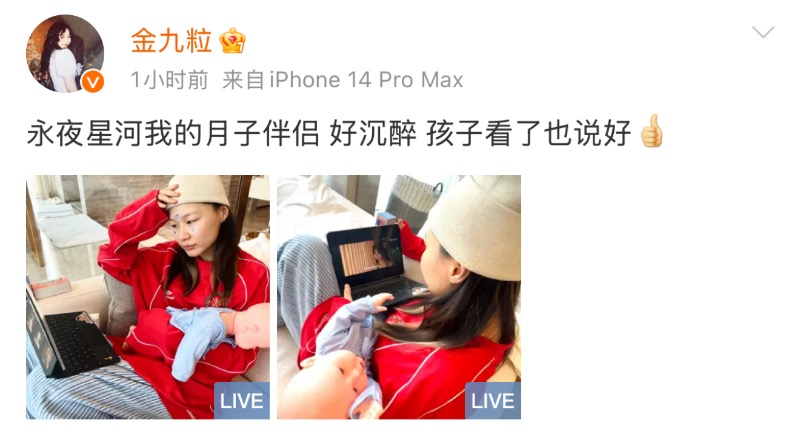 沒想到再看見金靖消息時,居然就在坐月子了!是達,金靖更新了微博,曬出自己抱假娃娃追劇的livte圖,並寫道:「永夜星河我的月子伴侶,好沉醉,孩子看了也說好。」