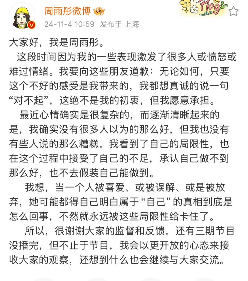 熱搜爆了!花學爭議罵不停!周雨彤發長文道歉!一句話再惹怒網友開噴! 綜藝星聞 By 歐巴是我的 On Nov 4, 2024 Share 就是說,周雨彤似乎怎麼回應都被罵啊!是達,都知道周雨彤參加了真人秀《花兒與少年》第六季之後,路人緣大崩壞,可以說掛在熱搜榜上快一個月了! 沉默了這麼久,周雨彤這次終於發長文回應近期爭議,表示向因為自己的表現,覺得憤怒或難過的朋友道歉! 雖然但是,她長文中提到的:「我確實沒有很多人以為的那麼好,但我也沒有有些人說的那麼糟。」讓網友認為她還是不懂自己錯在哪裡!全文如下👇 來看看網友熱評👇 目前已經爆了熱搜👇 圖來源:部分照片取自網路,若侵權請告知 Share