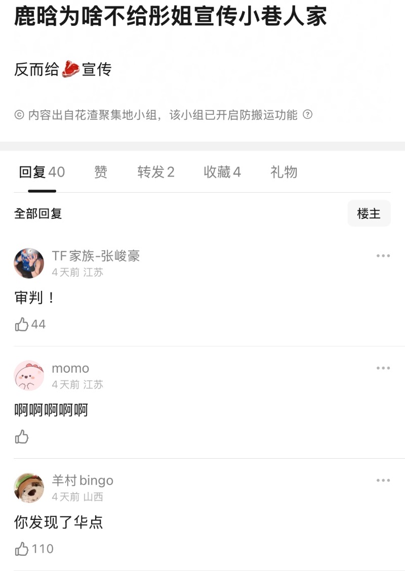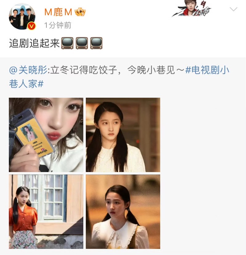 當時就有網友在線好奇,明明自己女友也有新劇《小巷人家》播出,怎麼鹿晗居然沒反應👇