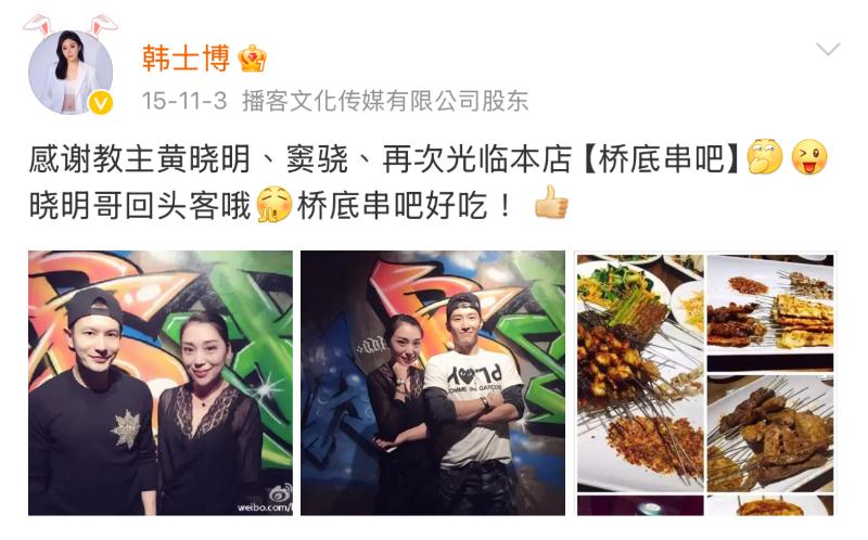 這裡科普一下,這位網紅從2015年就和黃曉明有交集,曉明哥也去過她的餐廳打卡👇