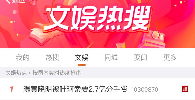 就是說,熱搜又又又爆了!是噠,這次主角依然是我們人到中年找到第二春的黃曉明,和他的黑紅路線女友葉珂,而熱搜詞是「曝黃曉明被葉珂索取2.7億分手費!」閱讀量相當驚人,直接破千萬!