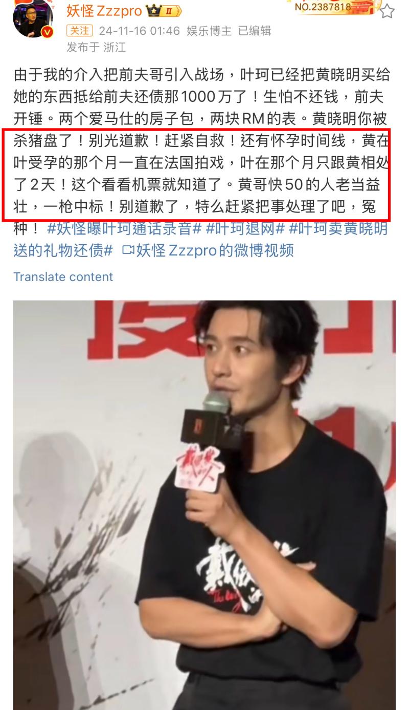 更炸裂的是,除了預告了葉珂將註銷微博號,這位博主還轉發了黃曉明在新電影首映禮上道歉的影片,並表示葉珂為了阻止前夫爆料,已經將她欠對方的1000萬歸還~但更炸裂的是,妖怪還喊話黃曉明,查查葉珂的懷孕時間線,表示葉珂受孕時間,黃曉明明明就在國外拍電影…
