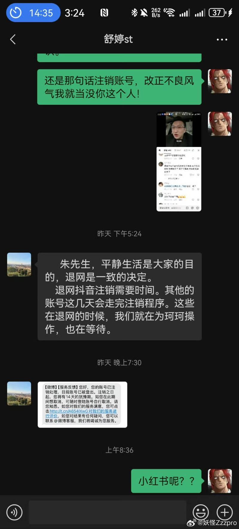 而他公開的聊天截圖,裡面提到了註銷賬號需要14天,值得注意的是,聊天另一方寫的並不是葉珂的名字👇