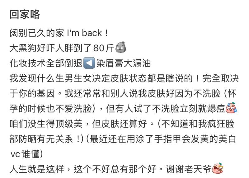 另外,也提到自己的皮膚狀態,表示皮膚好是因為不洗臉,但有些人試了不洗臉就立刻爆痘,所以覺得自己雖然沒頂級美,但皮膚還算好~全文如下👇