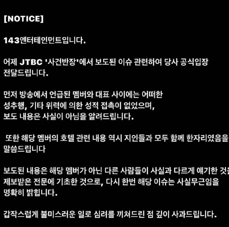 隨著熱議,公司所屬社再次發表立場全文,表示在節目中提及的成員和公司代表之間沒有發生過任何性騷擾,及其他強迫性的性接觸,報道內容也不是事實。
