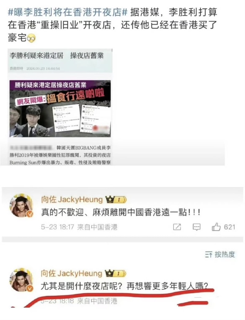 到底這兩人有什麼關聯呢?之前曾傳出李勝利將在香港定居及開夜店,當時向佐特別公開發文喊話,表示拒絕讓他來港定居!