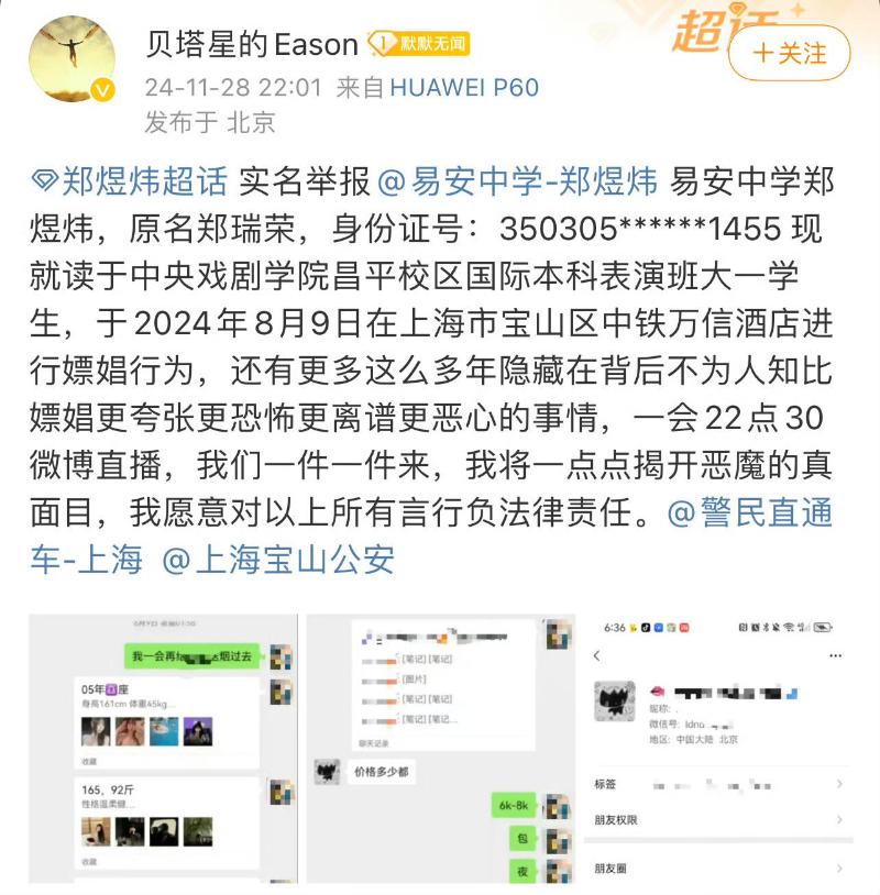 鄭煜炜出生于2004年11月28日,剛剛好過完20周歲生日,還是中戲在讀大學生,雖然他在娛樂圈名不見經傳,但多少算個小偶像,是易安中學男團的成員。28號晚上,認證為某娛樂公司CEO的網友,實名舉報鄭煜炜嫖娼,並公開疑似鄭煜炜聊天記錄。