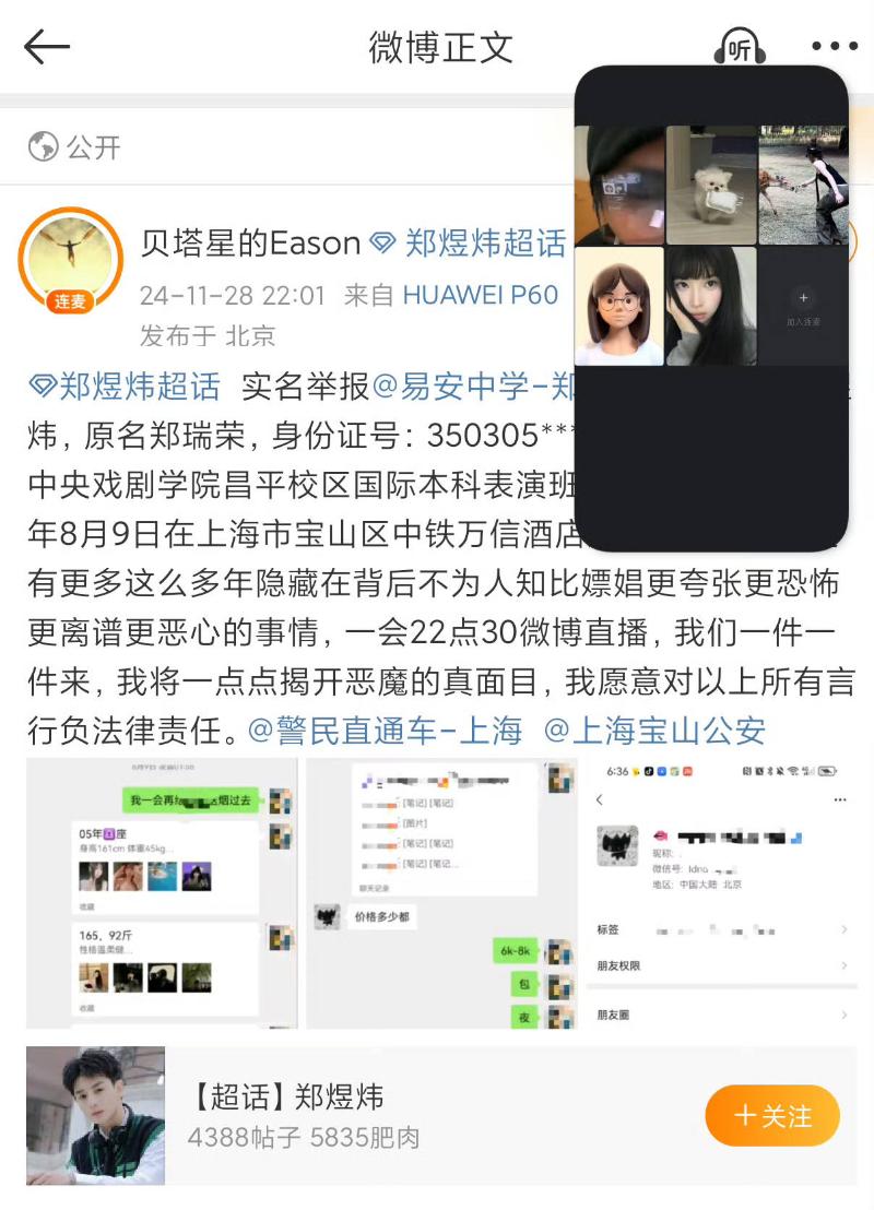 不僅如此,這位網友還直播和網友連線,爆料鄭煜炜有女友,還家暴,各種令人咋舌的事迹。有人問他和鄭煜炜什麽關系,這個網友支支吾吾,網友們猜測他包養了鄭煜炜六年。此次,是因為他看到鄭煜炜嫖娼,大發雷霆,所以才舉報了。