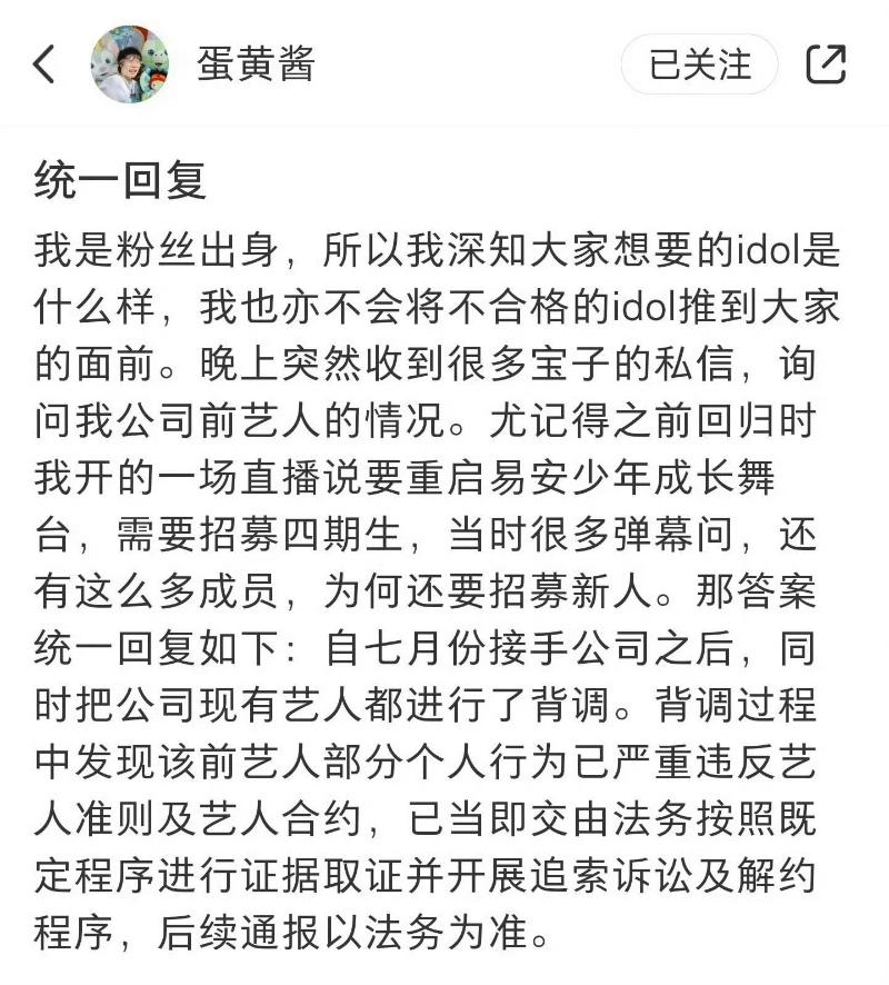 對此,黃銳回應表示:已對公司藝人進行背調,背調過程中發現該前藝人部分個人行為已嚴重違反藝人准則及藝人合約,已開展追索訴訟及解約程序,並表示:「不會將不合格的idol推到大家的面前。」