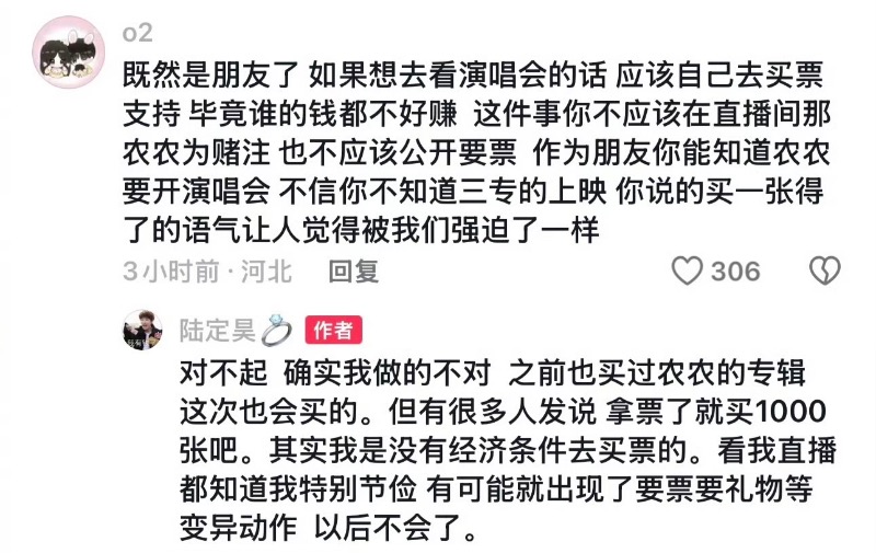 另外陳立農開演唱會,送給陸定昊一張門票,彈幕說:「那你也買陳立農的專輯」,卻被陸定昊回覆說:「那買一張吧~ 」再次引起陳立農粉絲不滿,因為門票上千元,一張專輯一二十元。
