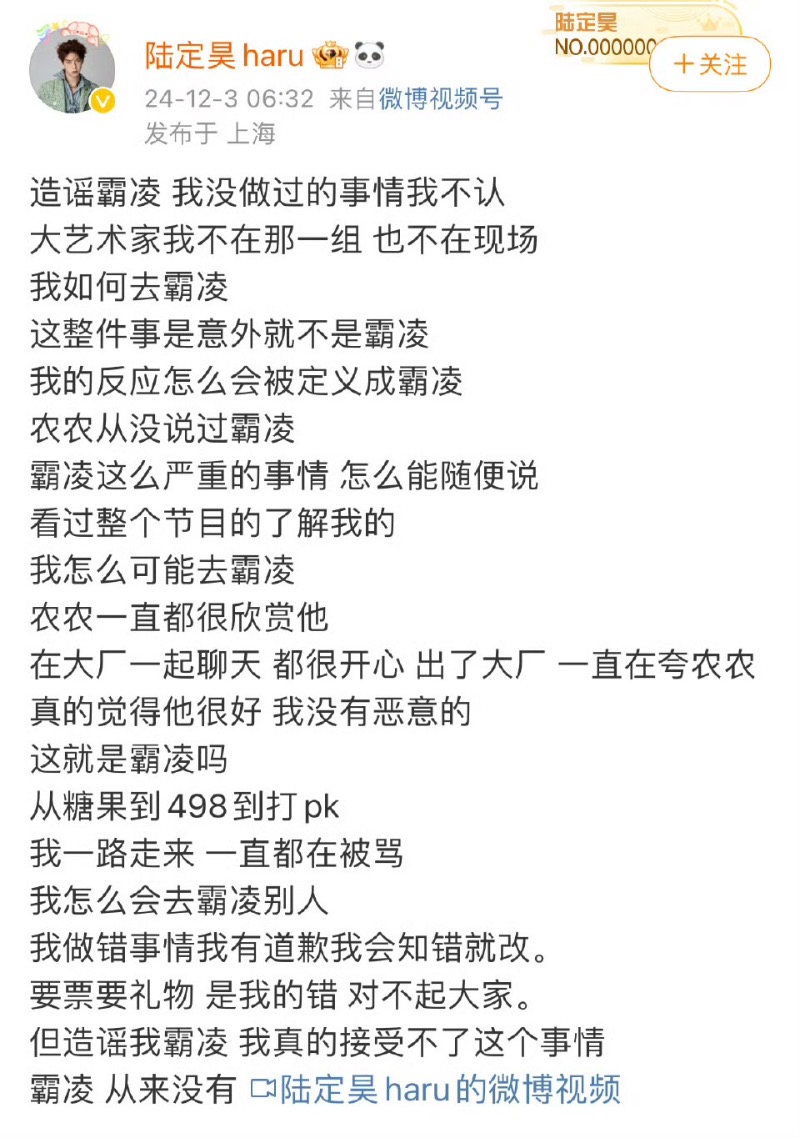 隨著熱議,陸定昊發微博道歉,說自己沒有霸凌過陳立農,表示:「造謠欺凌,我沒做過的事情我不認」,稱自己不在《大藝術家》那一組也不在現場,自己一直很欣賞陳立農,承認「要票要禮物是我的錯」,但是「欺凌從來沒有。」