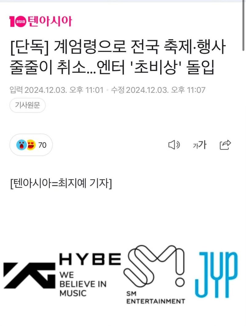 根據韓媒,主要娛樂公司的藝人接二連三地接到電話,要求從明天(4日)開始不要來參加活動。在戒嚴令的情況下,以難以進行地方慶典或活動等內容向藝人進行了緊急聯絡。