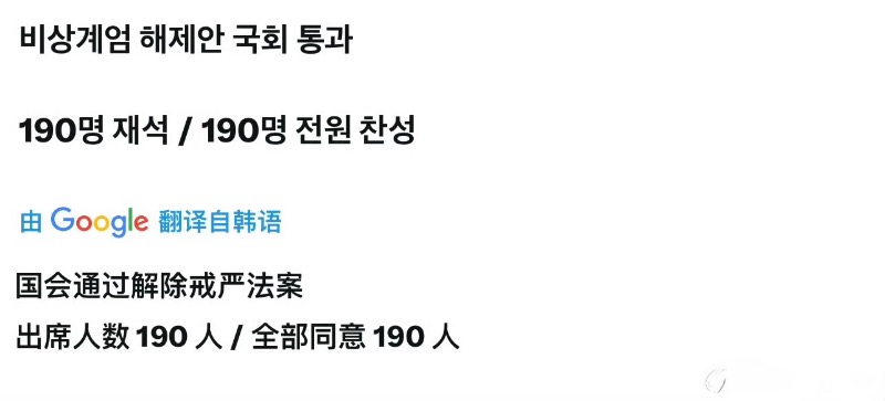 4號凌晨最新更新:韓國國會4日凌晨舉行緊急全體會議,就「要求解除緊急戒嚴令」進行了投票。 190名議員出席了此次會議並投了贊成票,韓國國會議長禹元植隨後宣布緊急戒嚴令無效。