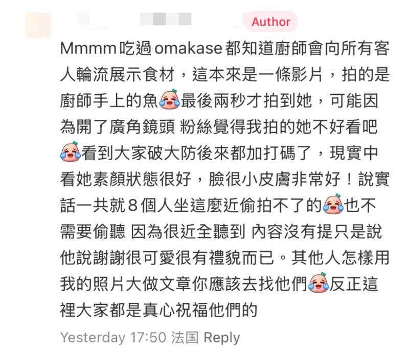 原Po也表示這家餐廳只能容納8人,所以自己也不是故意偷聽,並強調Lisa素顏狀態很好👇