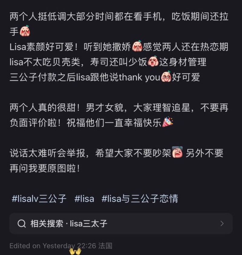 根據偶遇的網友透露,兩人在一起互動十分甜蜜,吃飯都還牽著手,Lisa甚至還和對方撒嬌,看得出還在熱戀期👇