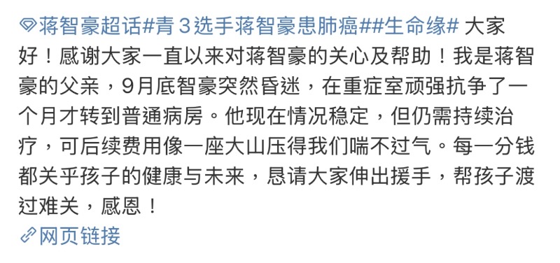 是達,一直有在關注這個新聞的,對蔣智豪應該不陌生!這位曾參加《青春有你3》的28歲年輕藝人,在2023年曾發文公開自己患上了末期肺癌的殘酷事實,引起全網關注!