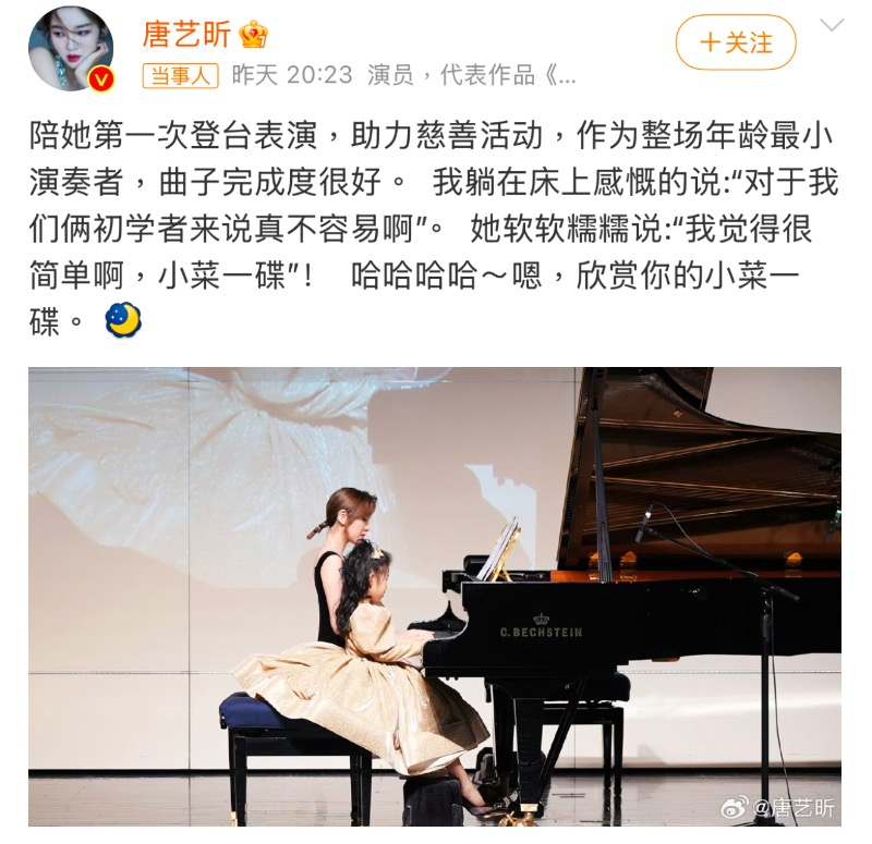 是達,唐藝昕發文,公開了和女兒一起彈琴的照片,分享了女兒表演的趣事,看得出小公主和爸爸一樣,十分的有自信!
