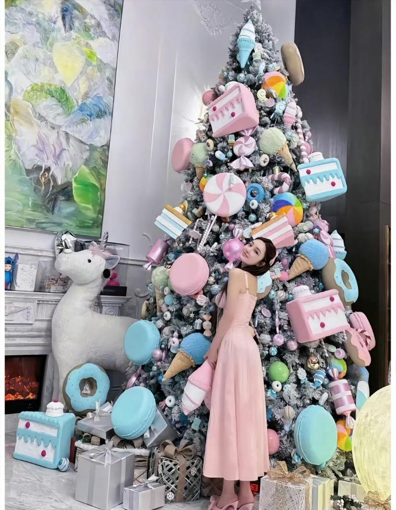 而在2023年,她那顆4米高的聖誕樹,被掛上了滿滿當當的粉色甜品主題裝飾,真的超夢幻👇
