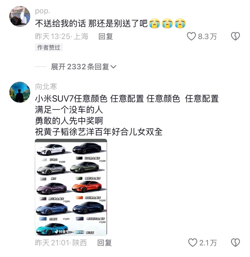 而黃子韜對徐藝洋的態度,不時被網友笑是霸總小說看太多,只不過這次受益對象,變成了直播間網友!沒錯,黃子韜日前突發奇想,表示如果自己粉絲人數突破2000萬,就準備送車!