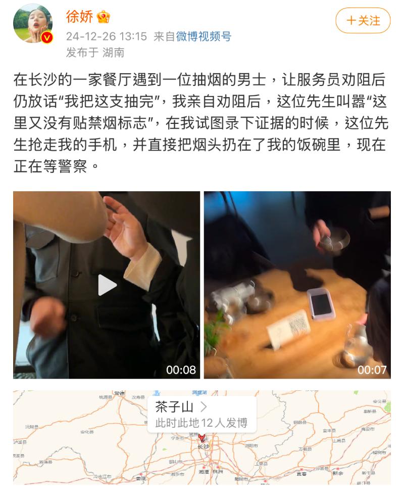 先來看看,徐嬌文中提到自己在長沙一家餐廳內,遇到一位抽煙的男士,經服務員和自己勸阻後仍堅持抽煙,並表示店內沒有禁煙標識。不但拒絕停止抽煙,甚至搶走徐嬌手機,還把煙頭丟進徐嬌碗裏,之後徐嬌報警。