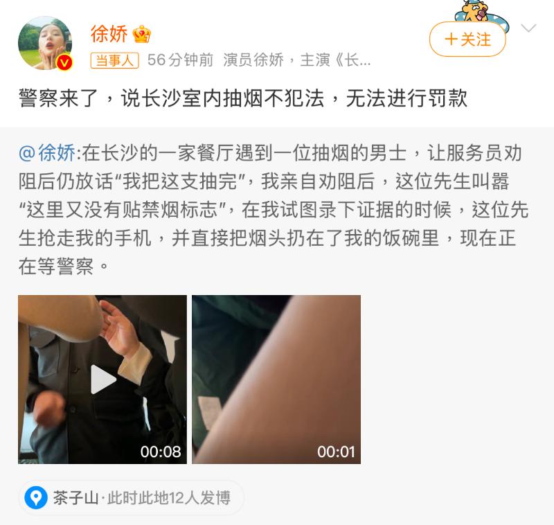 隨後徐嬌再發帖,表示警察來了之後表示,長沙室內沒有禁煙,因此無法罰款處罰該男士。