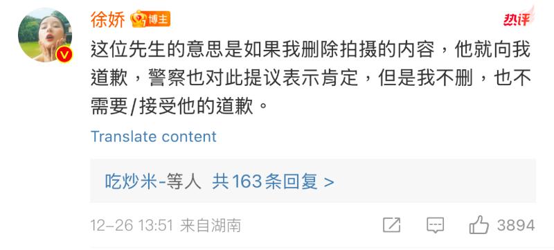 徐嬌也在微博評論中提到,這位男士表示如果她刪掉微博內容就道歉,但她堅持不刪,稱不需要男士的道歉。