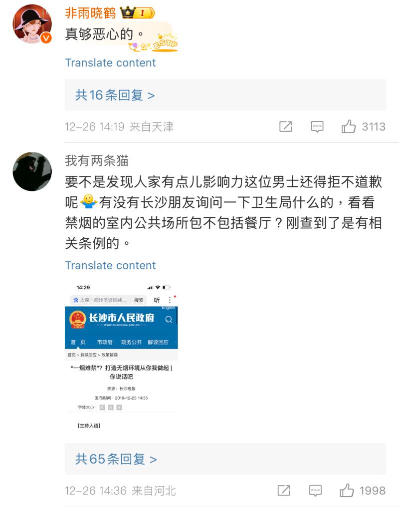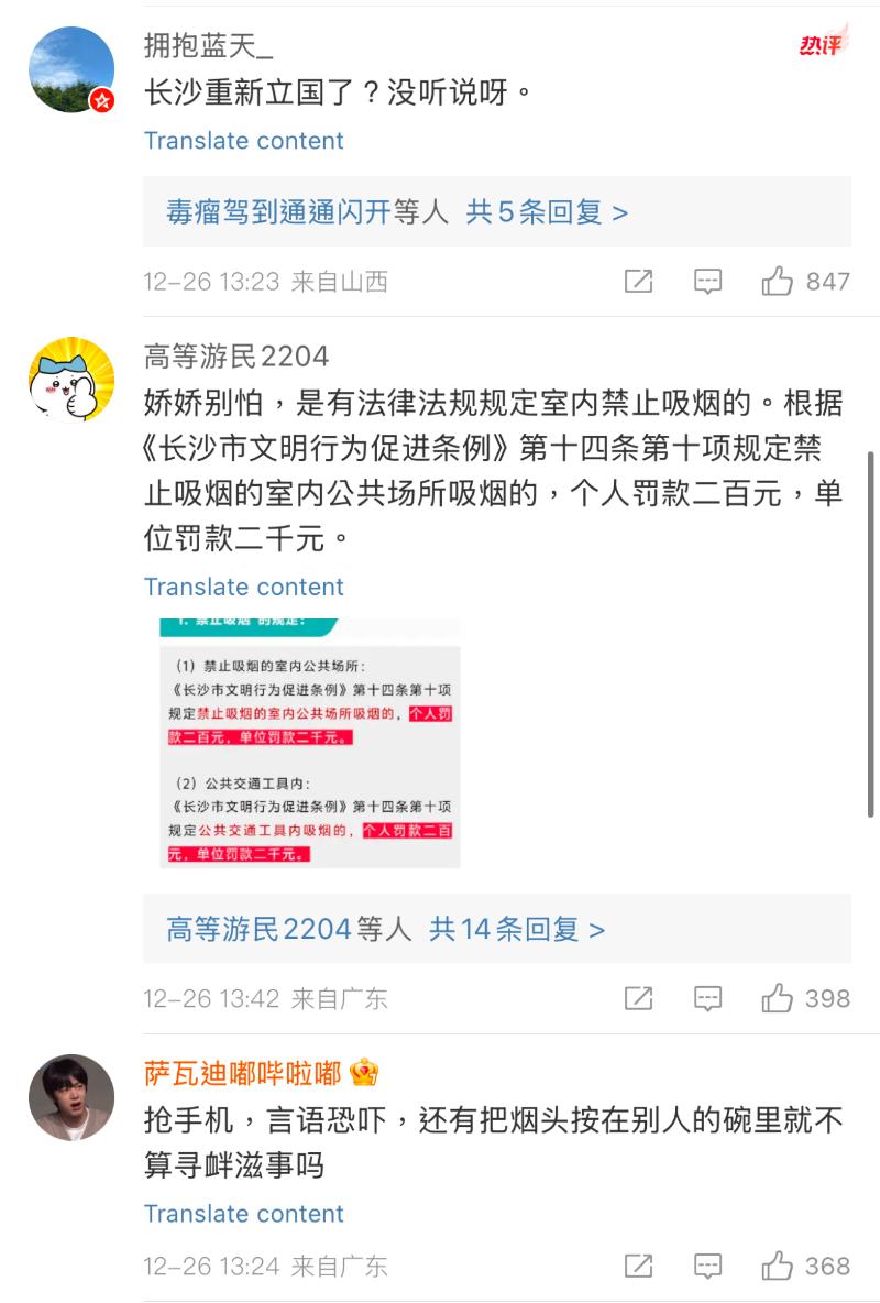 隨後徐嬌再發帖,表示警察來了之後表示,長沙室內沒有禁煙,因此無法罰款處罰該男士。