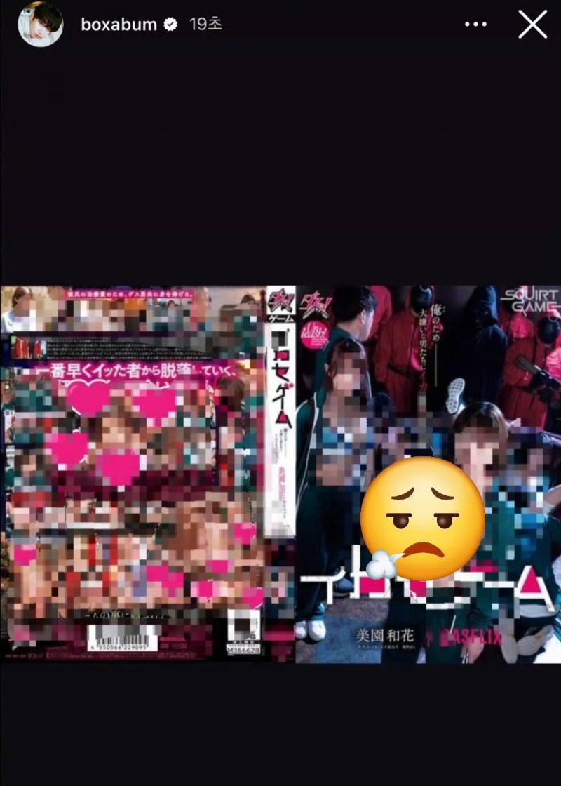 沒想到的是,朴成焄30號也因為《魷魚遊戲》再次引起熱議,原因居然是因為…上傳了AV版《魷魚遊戲2》的封面,滿屏都是18XX的裸女(下圖已馬賽克處理)👇