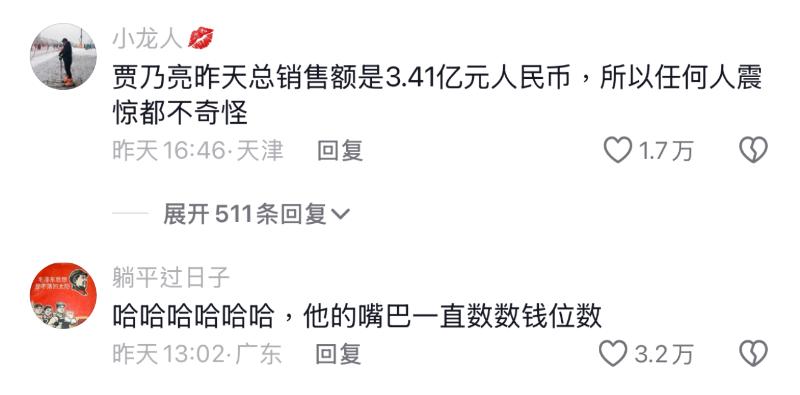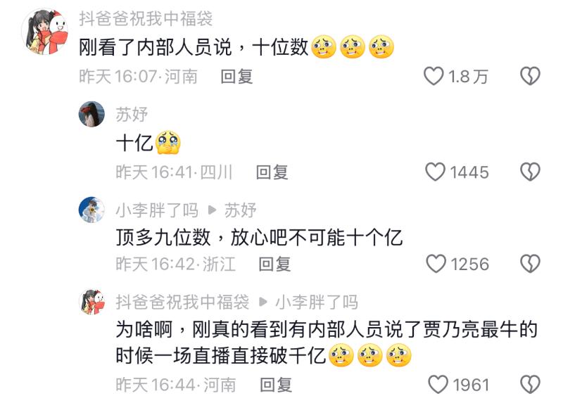 重點來了,到底賈乃亮當天直播間賣了多少呢?有網友說工作人員說了破億(人民幣,下同)👇