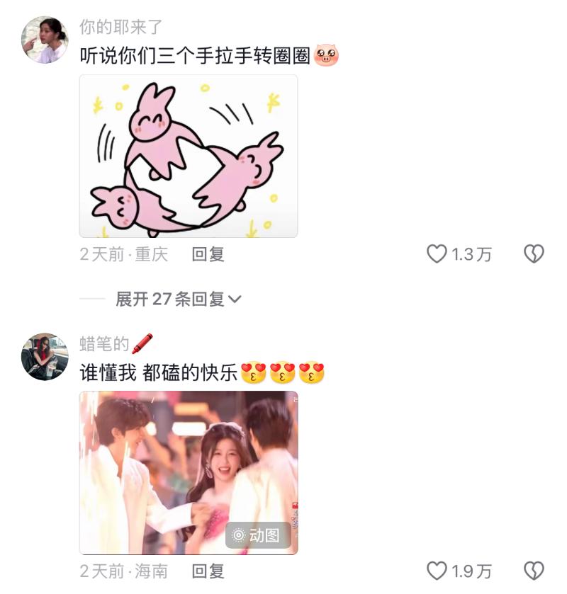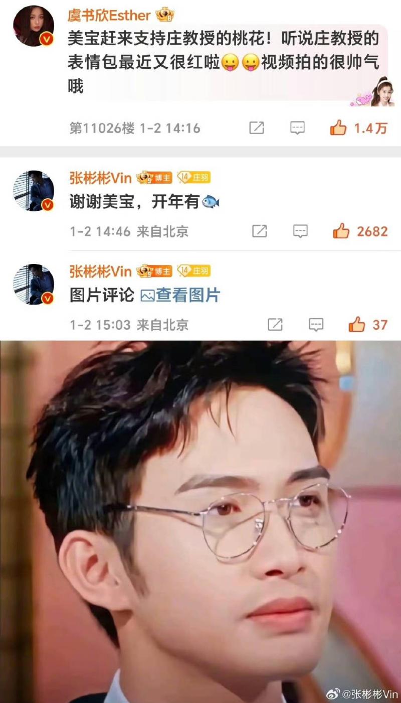 更抓馬的來了~適逢張彬彬、孫珍妮主演的《千朵桃花一世開》,沒想到虞書欣居然到張彬彬微博為他新劇助力,甚至主動cue了張彬彬的表情包,而張彬彬還用了表情包回復!