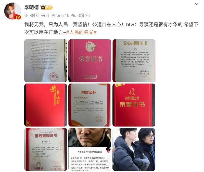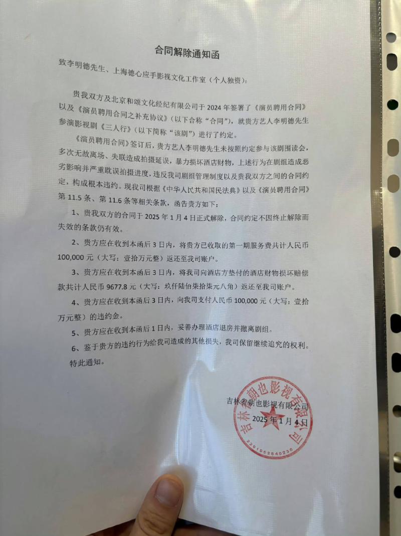 隨後還發文喊話《三人行》劇組,表示:「我將無我,只為人民!我堅信!公道自在人心!btw:導演還是很有才華的 希望下次可以用在正地方~」並還曬出了劇組解約通知書,要求李明德1日內退房離開劇組,退還第一期服務費10萬,同時賠償酒店被損壞的物品9677.8元,以及違約金10萬。