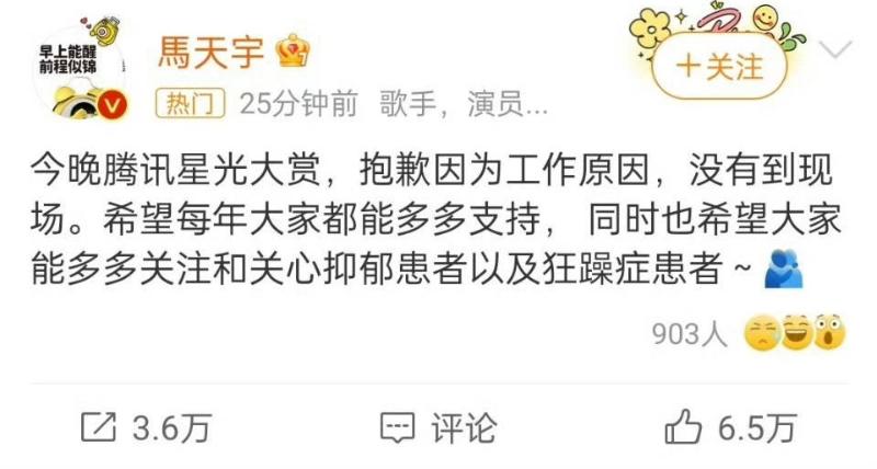 至於馬天宇這方面,先是在凌晨發了一則貼文,表示自己缺席星光大賞的原因,最後提了一句希望多關注抑郁患者和狂躁症患者,疑似內涵李明德,評論區直接淪陷👇