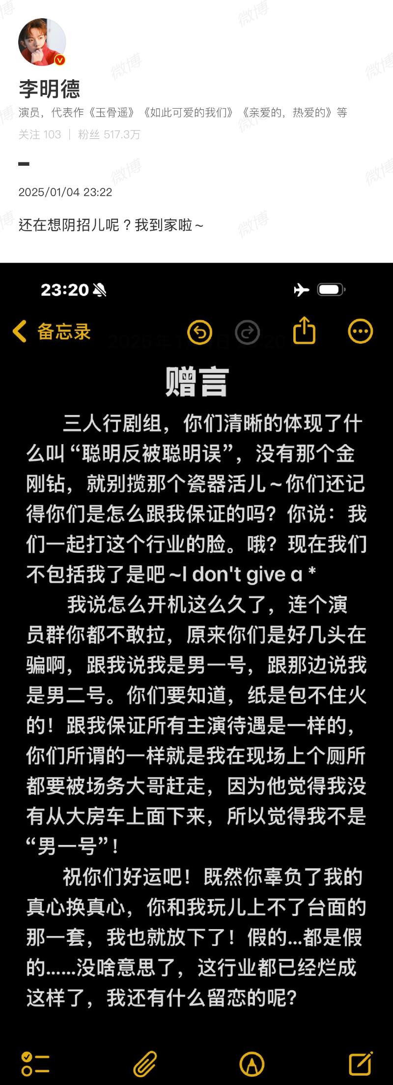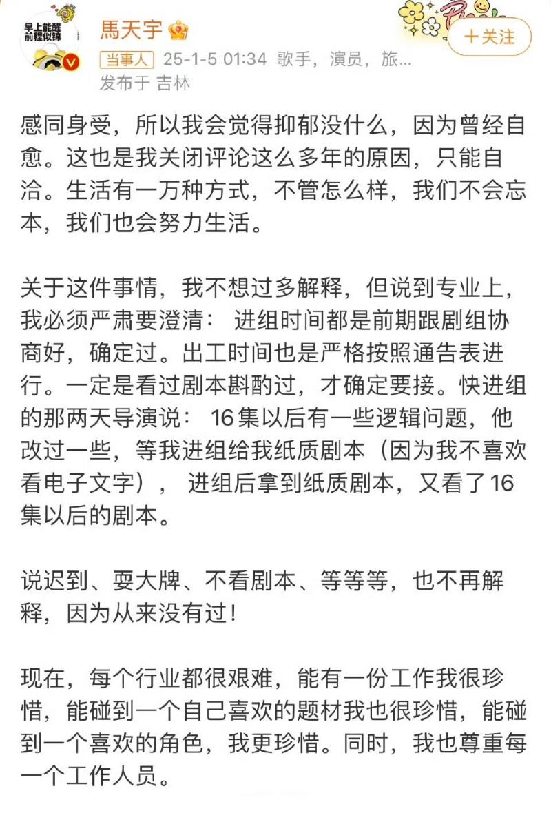 馬天宇隨後刪博,再次發了長文回應,這次提到了自己曾患抑鬱症,本來不想回應,但必須澄清自己所有進組時間都協商好,李明德指控他沒看劇本的原因,是因為進組前導演說做了修改,因為自己不看電子版,所以等進組了才拿到紙質劇本。對於其他指控,也一一否認👇