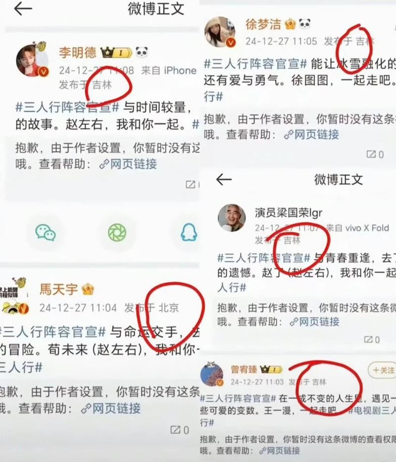 另外,馬天宇在開機當天,微博IP也依然在北京,但其他主演們全都已經在拍攝地吉林👇