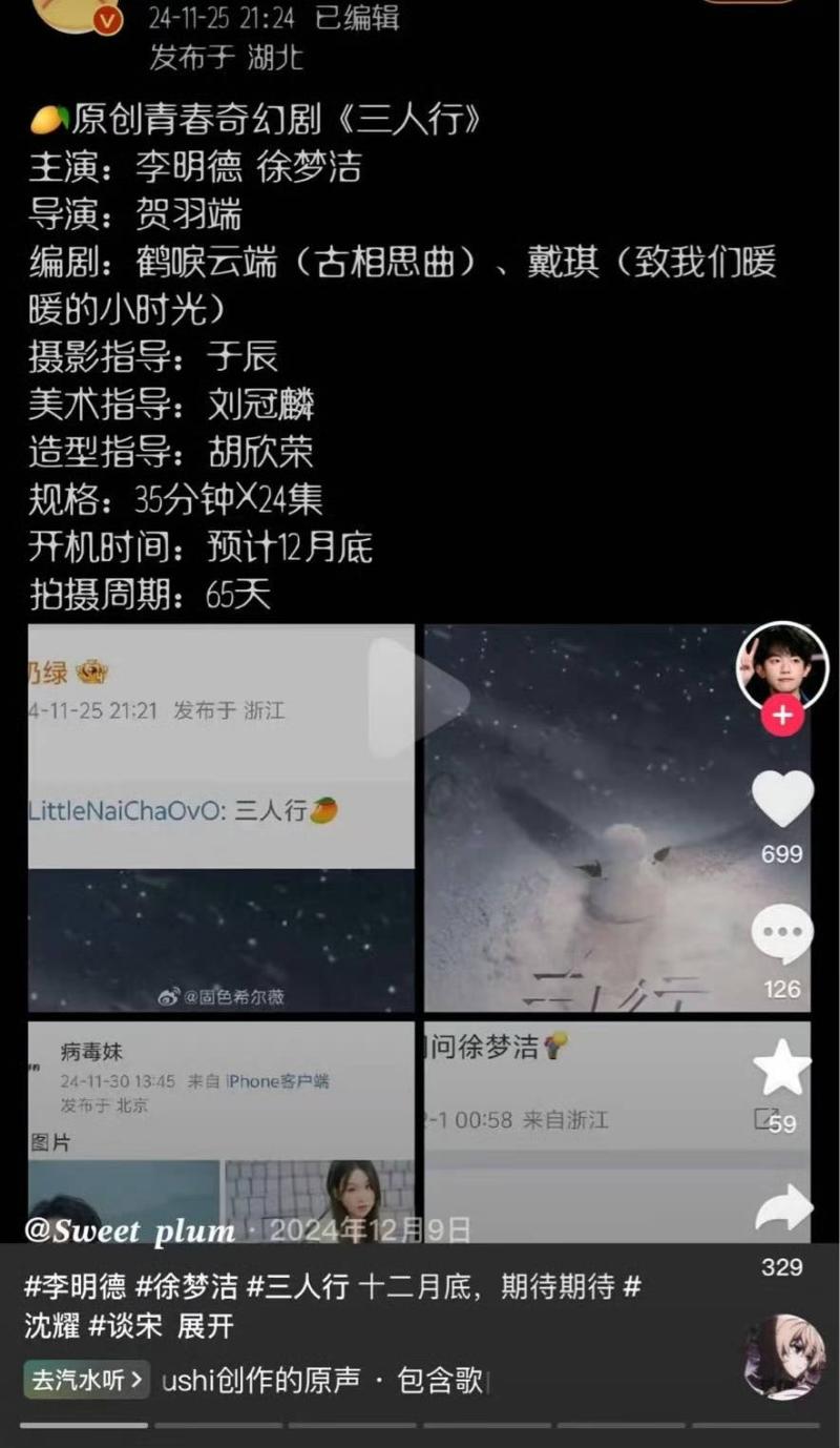 再來就是,有網友扒出之前的瓜,原定《三人行》男一是李明德,後來官宣時變成了馬天宇,和李明德在機場提到的被換角對上了👇