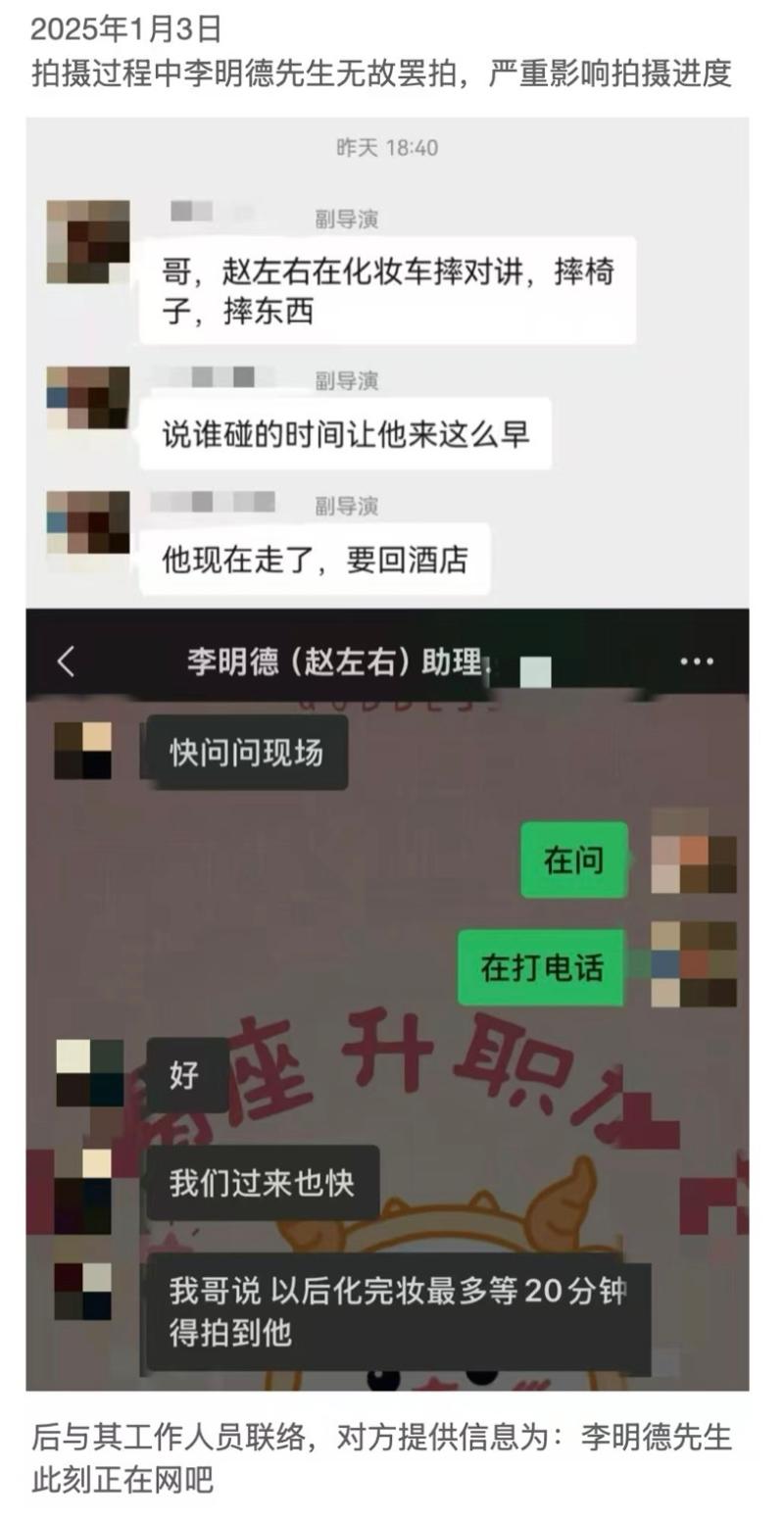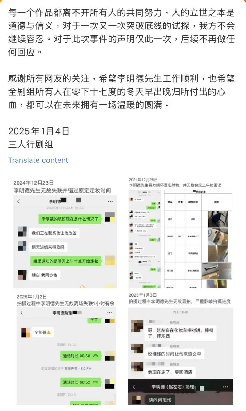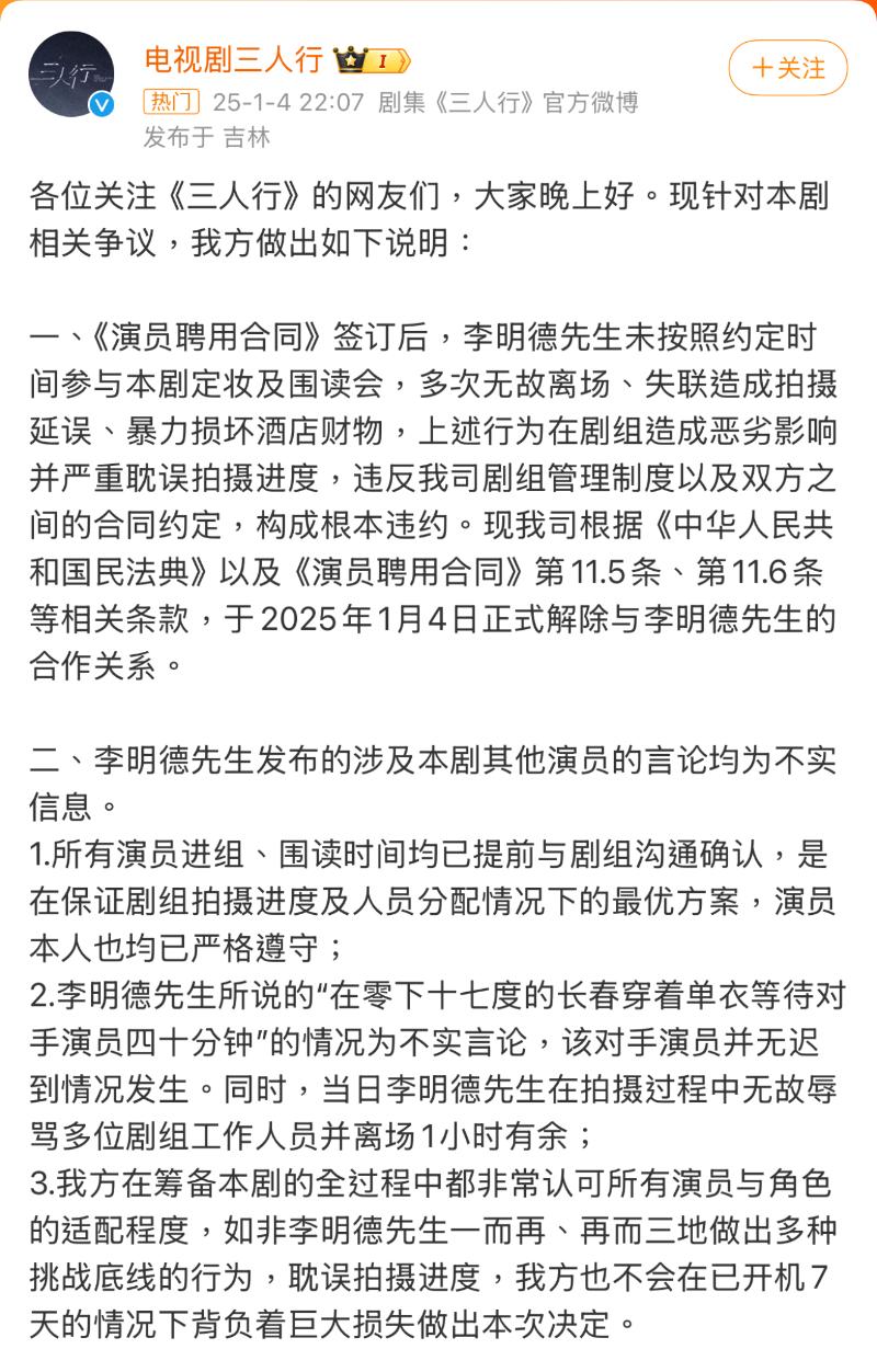 到底事情隨後怎麼發展?現在先來看看當事3方之後的回應,分別是:《三人行》劇組,李明德和馬天宇~劇組方面,在4號晚間發了長文回應,當中提到李明德未按照約定時間參與定妝及圍讀會,多次無故離場,失聯造成拍攝延誤,甚至暴力損壞酒店財物,于1月4日正式解除與李明德先生的合作關係。