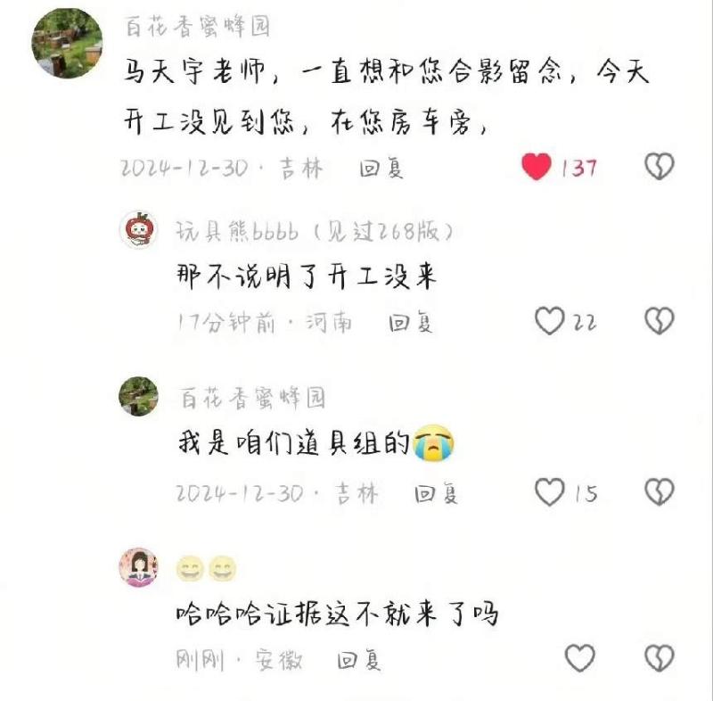 《三人行》的劇組人員微博,也錘了開拍時,馬天宇根本沒有在現場,首先包括了道具組的留言👇