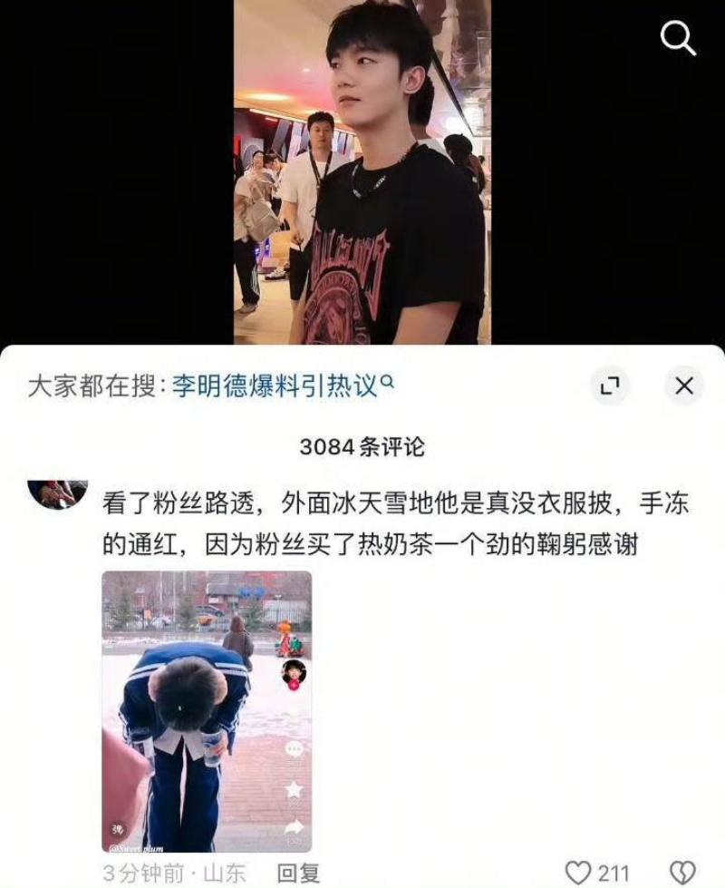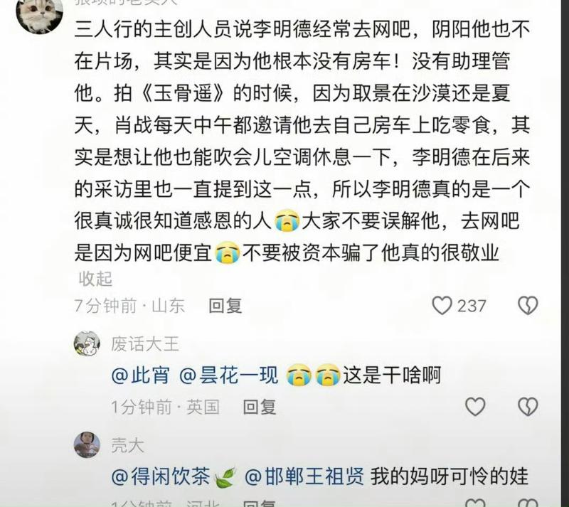 另外,在劇組回應中指控李明德拍攝時跑去網咖,就有網友扒出,原因很可能是因為李明德沒有房車,大冬天的需要躲在網咖避寒。網友也扒出在拍攝《玉骨遙》時,肖戰就因為得知他沒有房車,經常邀請他到自己房車休息吃零食,李明德在之後的訪問也一再提及並深表感謝。