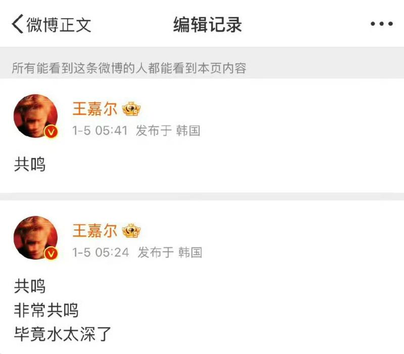 而王嘉爾在5號凌晨,也突然發博表示「共鳴,非常共鳴,畢竟水太深了」,隨後改成「共鳴」,被解讀在挺李明德?