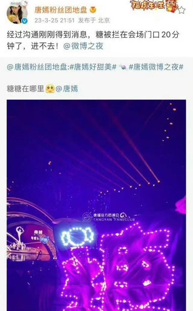 這裡順便科普一下,唐嫣在2023年的微博之夜,被傳因為塞車問題,導致被關在門外進不去內場,所以並未能如期登台領獎,當時直接爆了熱搜!