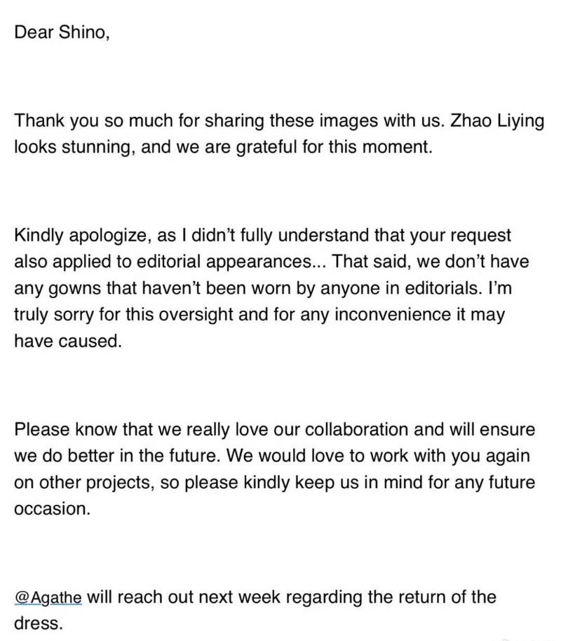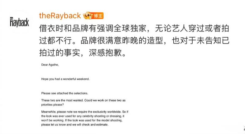 沒想到造型師閔塔鯊也很猛,6號這天直接發微博道歉,曬出了品牌方的道歉信,表示借衣時和品牌有強調全球獨家,無論藝人穿過或者拍過都不行。品牌很滿意昨晚的造型,也對于未告知已拍過的事實,深感抱歉。