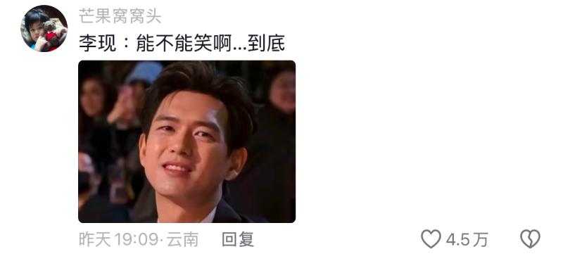 雖然但是,這一眾藝人的反應中,最最最好笑也最出圈的,莫過於我們的李現啦!是噠,來看看,當全場都在嗑「禹宙中欣」露出姨母笑時,一臉苦笑…甚至可以說有點愁容的李現,真的和其他人處在不一樣的畫風啊!