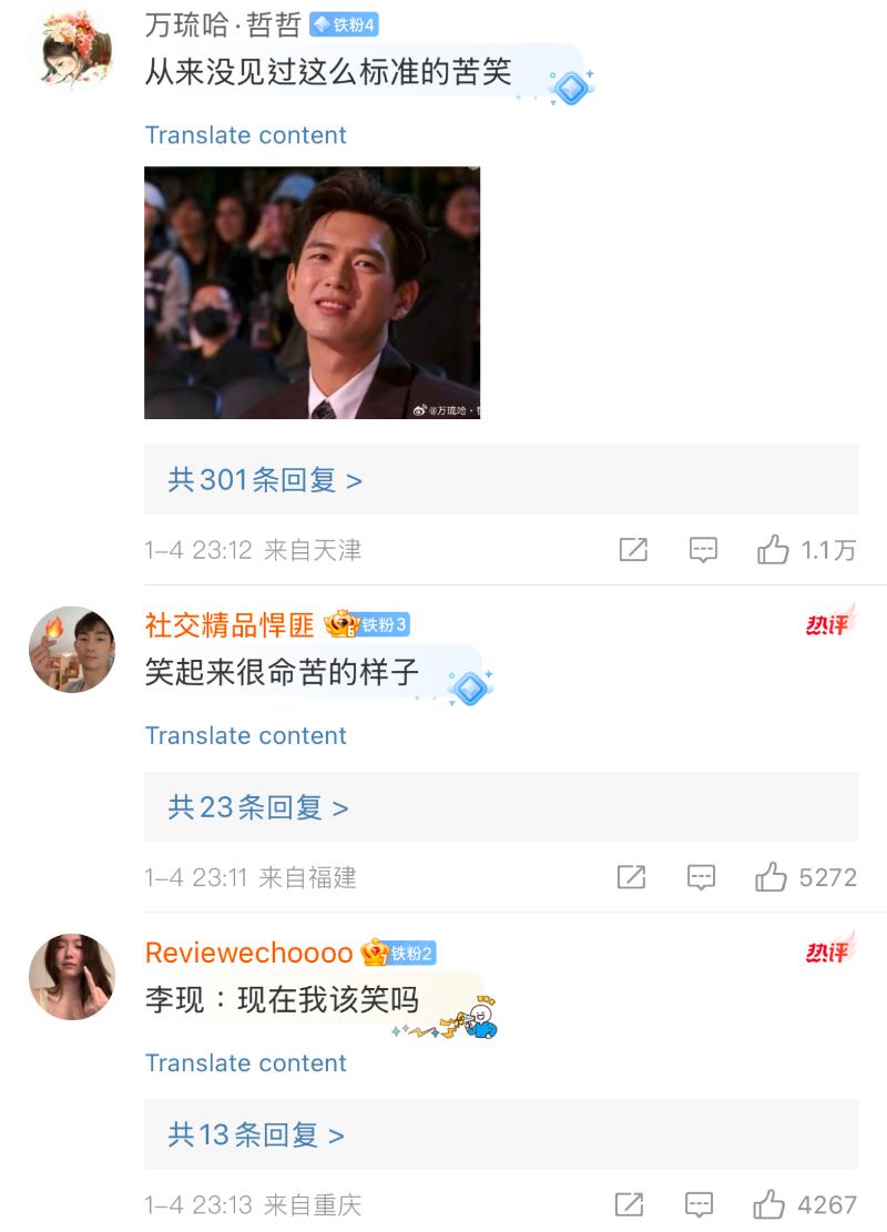 而在2023年的微博之夜,大會再次安排和平鴿李現上場,擋在90花楊紫和迪麗熱巴中間,當時就有網友出了金句「李現的命也是命」啊!