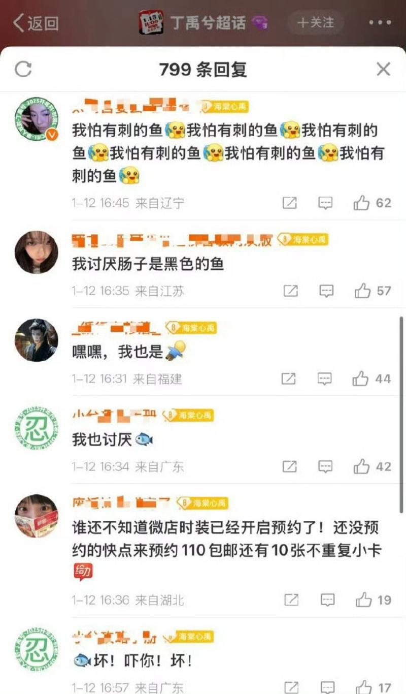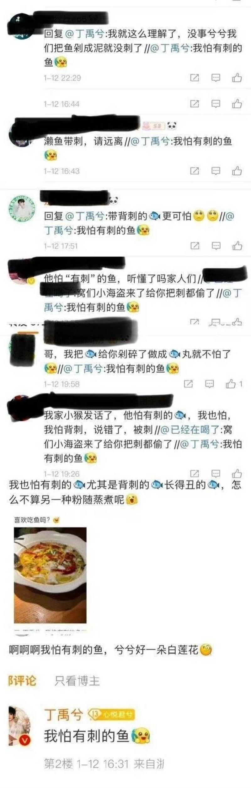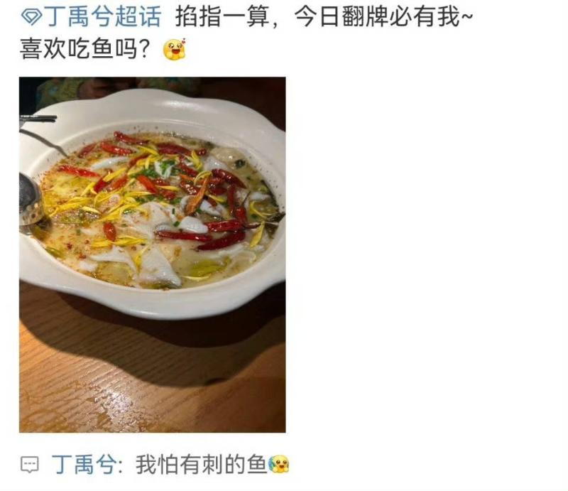 結果就是這個留言,引起了爭議,原因是粉絲問丁禹兮喜歡吃魚嗎?而小丁的回復是…「我怕有刺的魚」👇