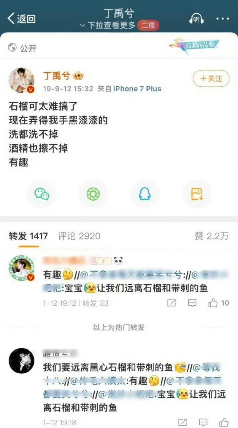 甚至連丁禹兮在2019年寫的微博都被扒出來,認為他在陰陽怪氣小石榴~這裡再科普一下,虞書欣粉絲名字就是「小石榴」👇