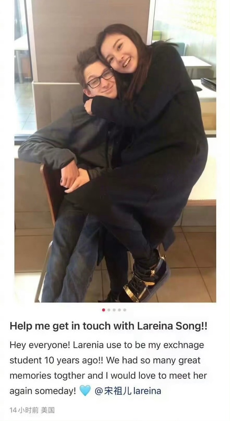 是達,有一名外國男網友在小紅書公開了多張和宋祖兒的親密合照,表示10年前她曾是交換學生,兩人之間有很多回憶,希望可以再次和她取得聯繫👇