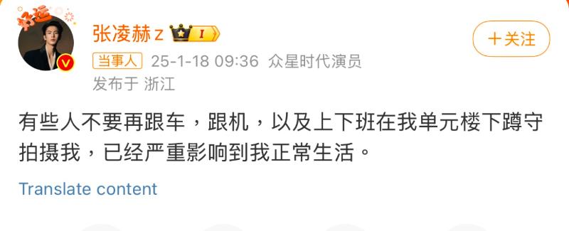 張凌赫在文中提到,希望私生不要再跟車,跟機,以及在自己住宿下拍攝,已經嚴重影響他的正常生活!