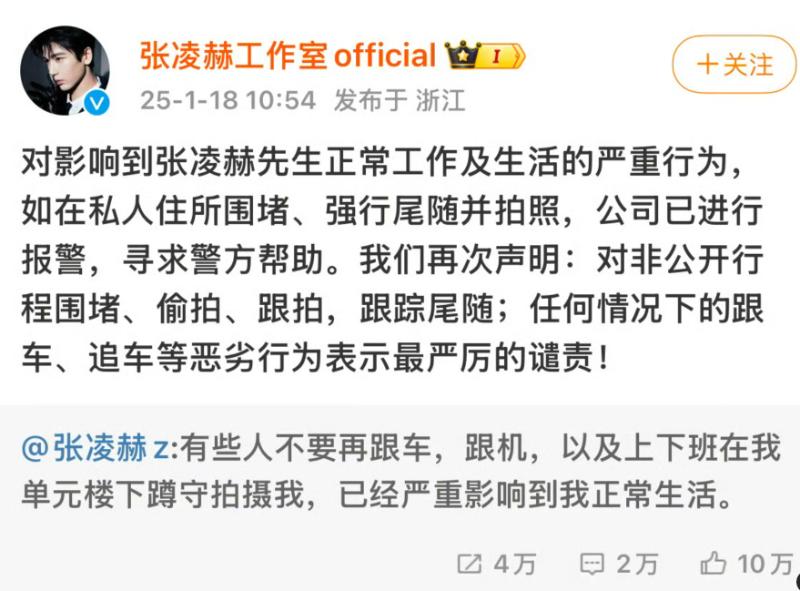 張凌赫在文中提到,希望私生不要再跟車,跟機,以及在自己住宿下拍攝,已經嚴重影響他的正常生活!