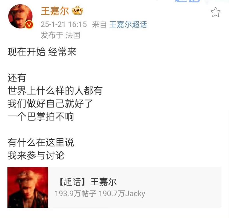 之後他在超話中發文,強調「世界上什麼樣的人都有,我們做好自己就好了,一個巴掌拍不響」,還表示自己會常來,有什麼在這裡說,他會來參與討論👇